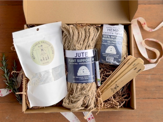 Vegetable garden string trellis, compostable twine, and compostable clips.