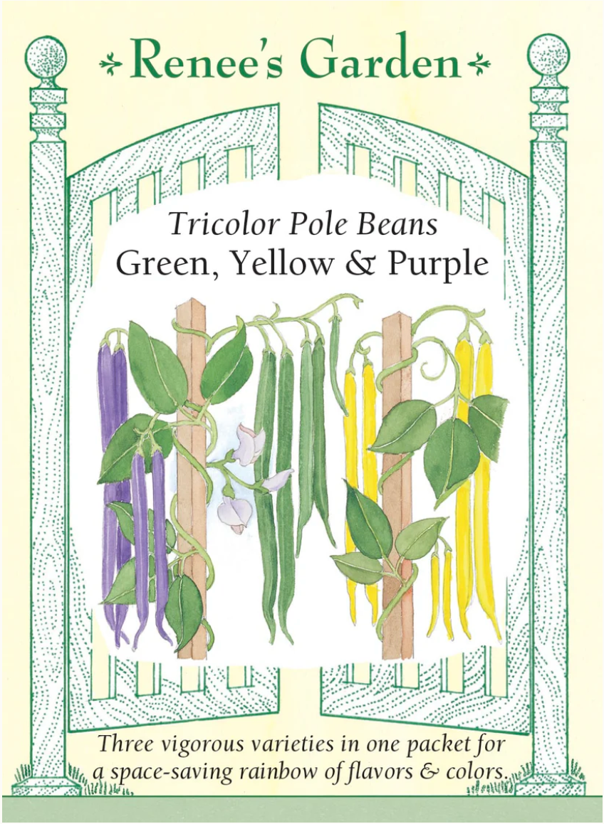 Cascading from their tall supports, our tricolor pole beans are sentinels of the abundant summer garden. Vigorous pole beans twine up effortlessly and their vertical habit makes good use of limited garden space. These heavy bearing climbers reliably produce extended heavy harvests of delicious long gold, green and burgundy pods. The generous bounty of juicy tender pods has that sweet and meaty bean flavor every cook loves in the summer kitchen.
