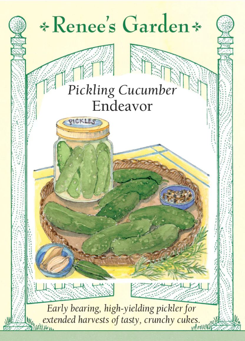 This early bearing pickling or “Kirby” cucumber is a kitchen garden dynamo that produces an extended harvest of dark green, crispy, curved fruits with the traditional knobby “pickle” skin. Hybrid Endeavor is great tasting and high yielding. Vines will keep you well supplied for putting up many jars of your favorite treats like kosher dills, bread-and-butter slices, relish and traditional sweet pickles. Endeavor is also a fine crunchy, fresh-eating cucumber right from the vine. Plants are resistant to mosaic viruses and downy mildew. Monoecious.