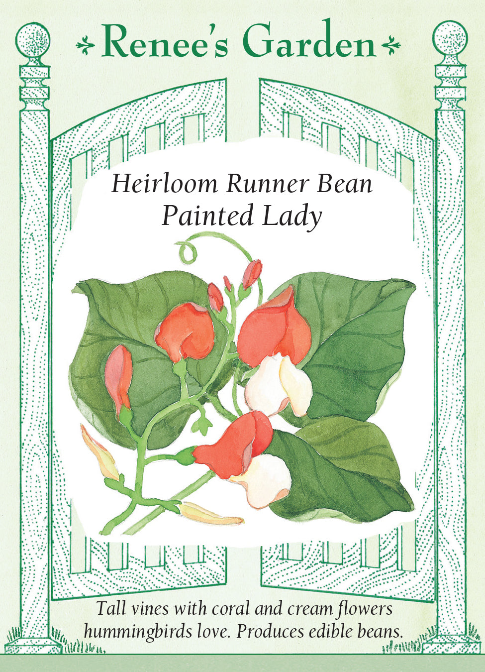 This hard to find heirloom runner bean is a true antique, dating back to the early 19th century. The vines readily climb 8 to 10 feet up any vertical support, creating a flowering screen. Painted Lady’s edible blossoms are uniquely bicolored with coral and creamy pink petals, especially pretty against the deep green foliage. Let some bean pods mature and enjoy their mocha and chocolate colored bean seeds displayed handsomely in glass jars to cook with all year round.